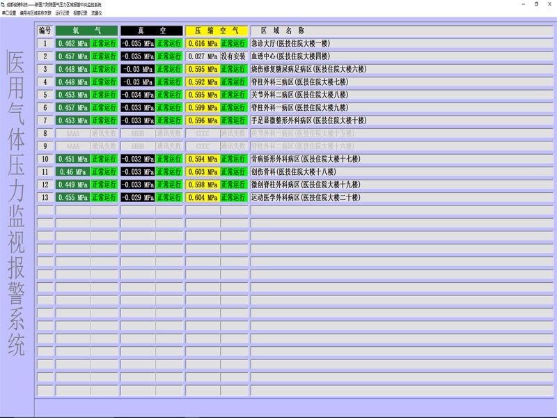 中央监控报警系统:适用于气压监测与远程控制的专用系统,主要由监测主机、气源监测分机、区域监测点、护士站监测点组成。系统采用PC机作为控制主机,安装在中心监测站,气源监测分机通过通讯总线与主机相连,不同总线将压力数据和报警信号等信息实时地传送给系统主机,从而达到供气管道压力的远程监控功能,各设备之间的通信均采用最为广泛的RS-485总线通信接口。